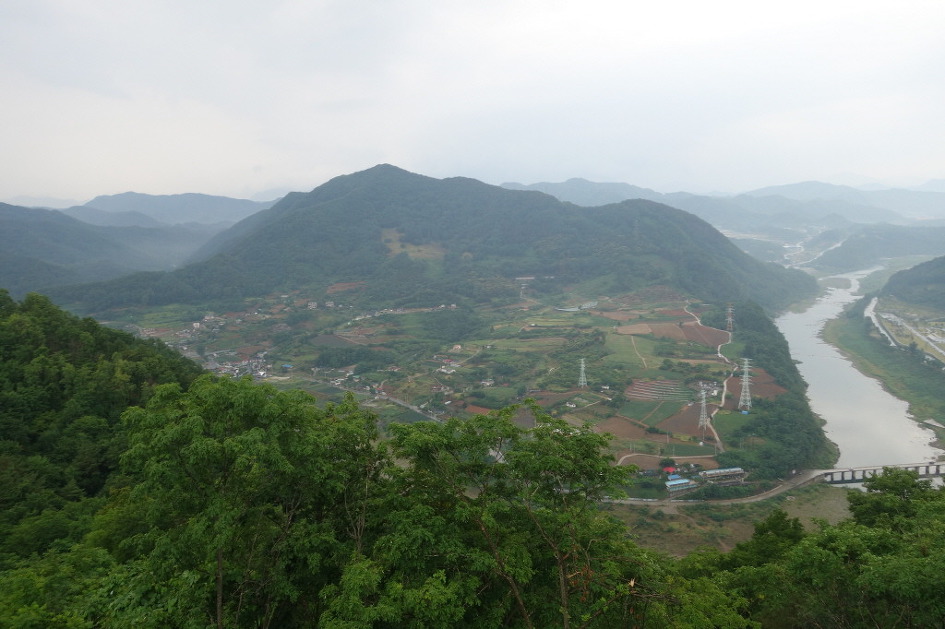 ↓.남한강 따라 고씨굴교가 희미하게 보이고 좌측은 마대산.