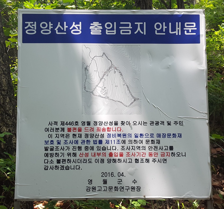 ↓.정양산성 출입금지 표지판이 있고 발굴작업으로 산길을 통제한다는 내용이다.