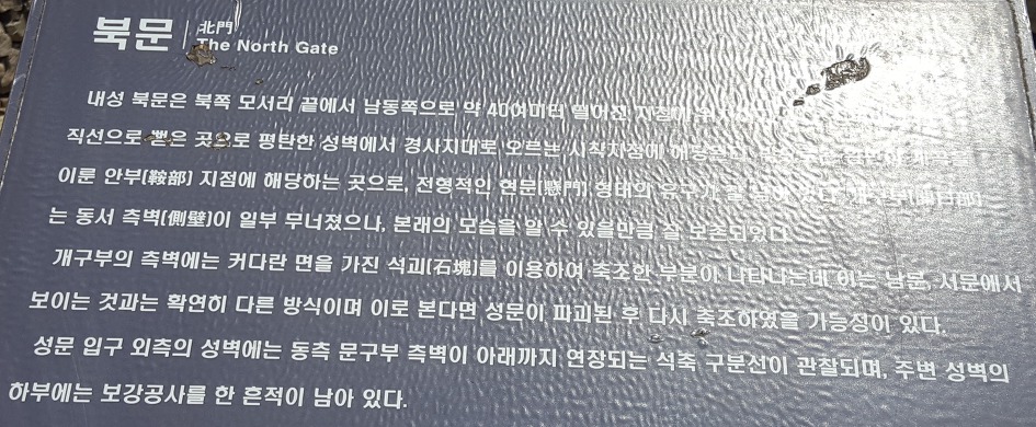 ↓.북문.안내판과 나란히 있는 북문 모습이고 뒤로 가야할 계족산 정상부가 보인다.