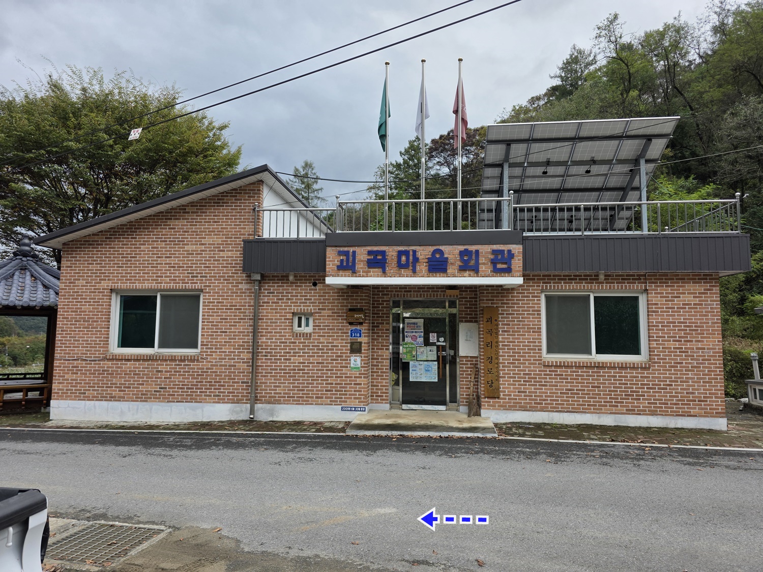 ↓.우측에 괴곡마을 회관을 지나간다.